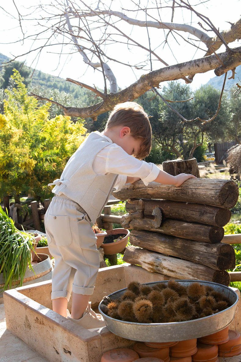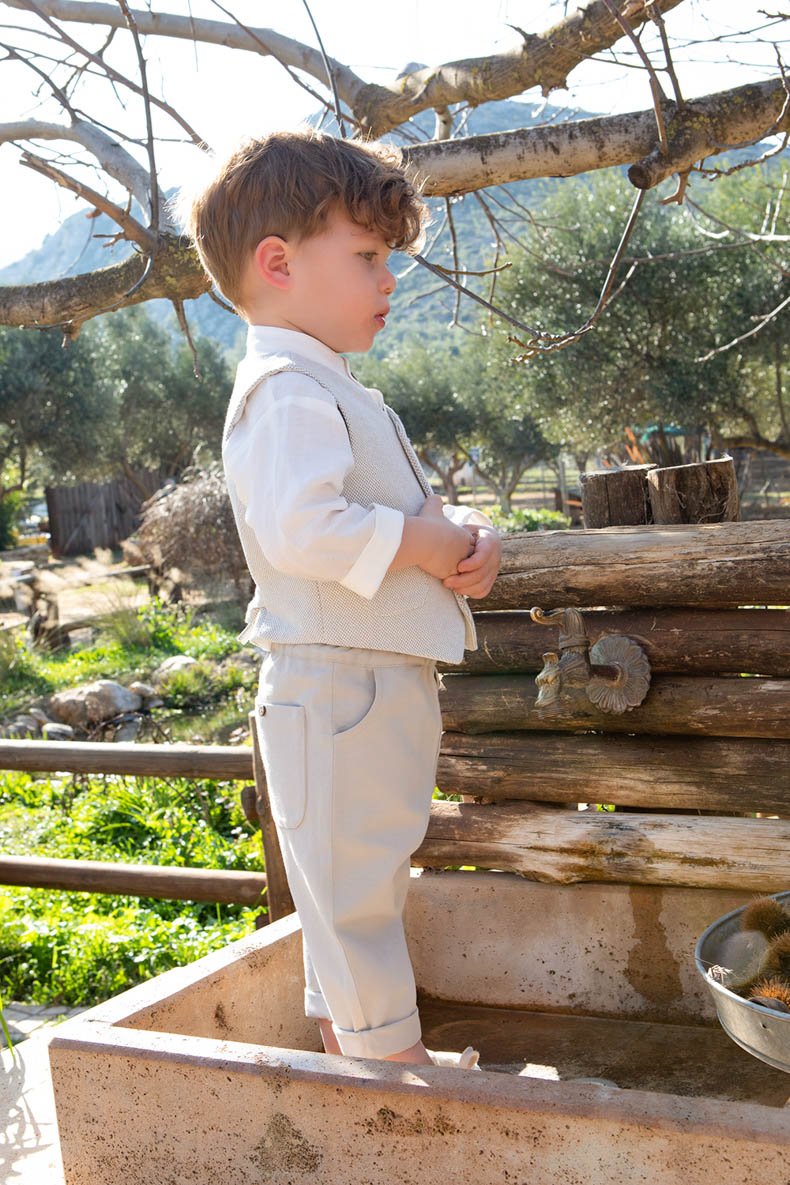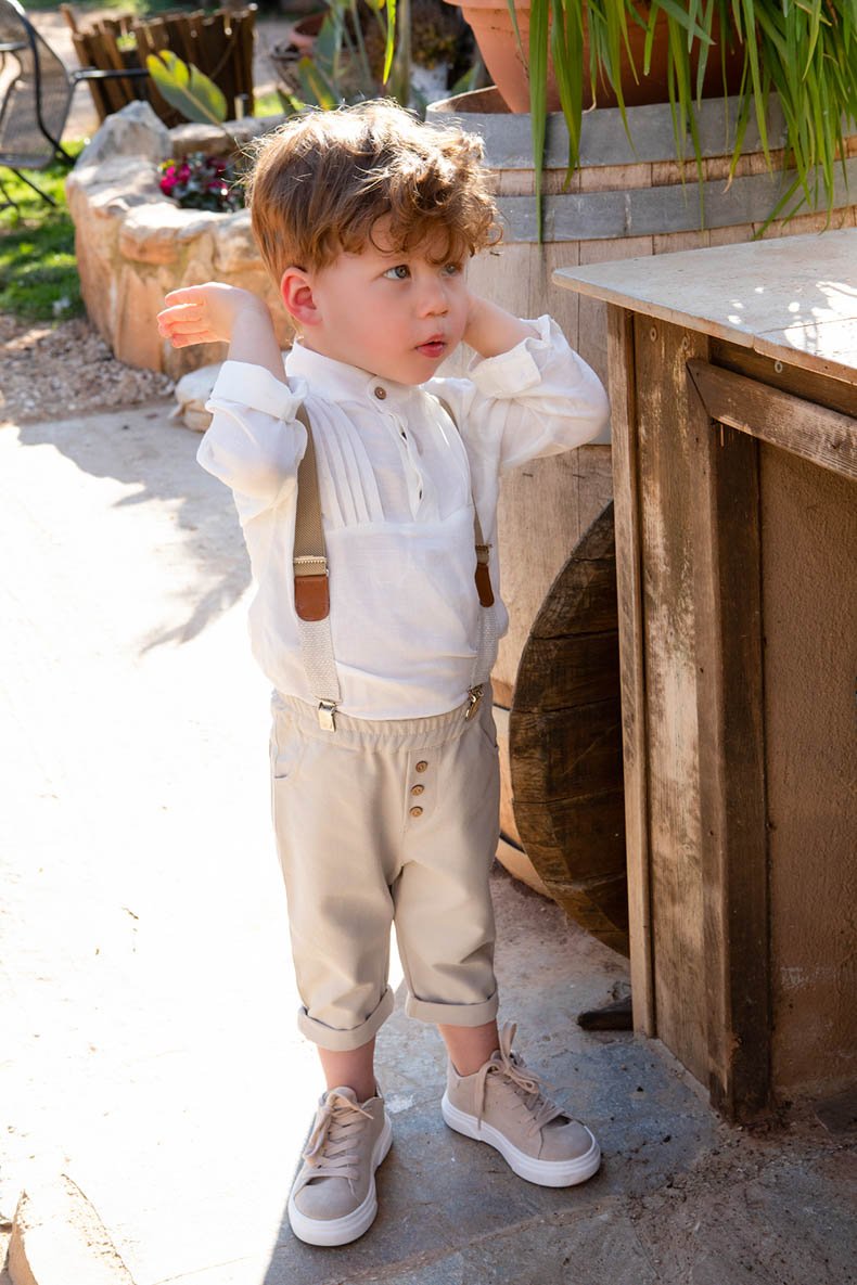 Ο Teddy είναι ένα classic chic βαπτιστικό ρούχο σε απαλό μπεζ χρώμα. Αποτελείται από μπεζ βαμ/ρο παντελόνι με τιράντες εκρού cotton, ιδιαίτερη πουκαμίσα με νερβίρ και γιλέκα από ψάθα εξαιρετικής ποιότητας. Αξεσουάρ το μαντήλι και το καβουράκι για το κεφάλι.